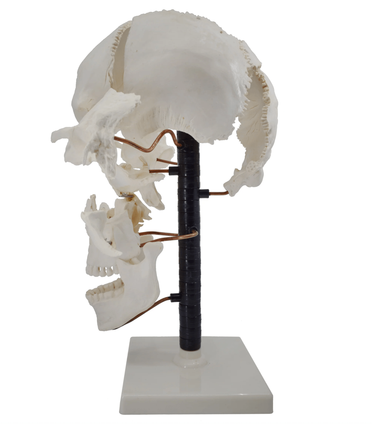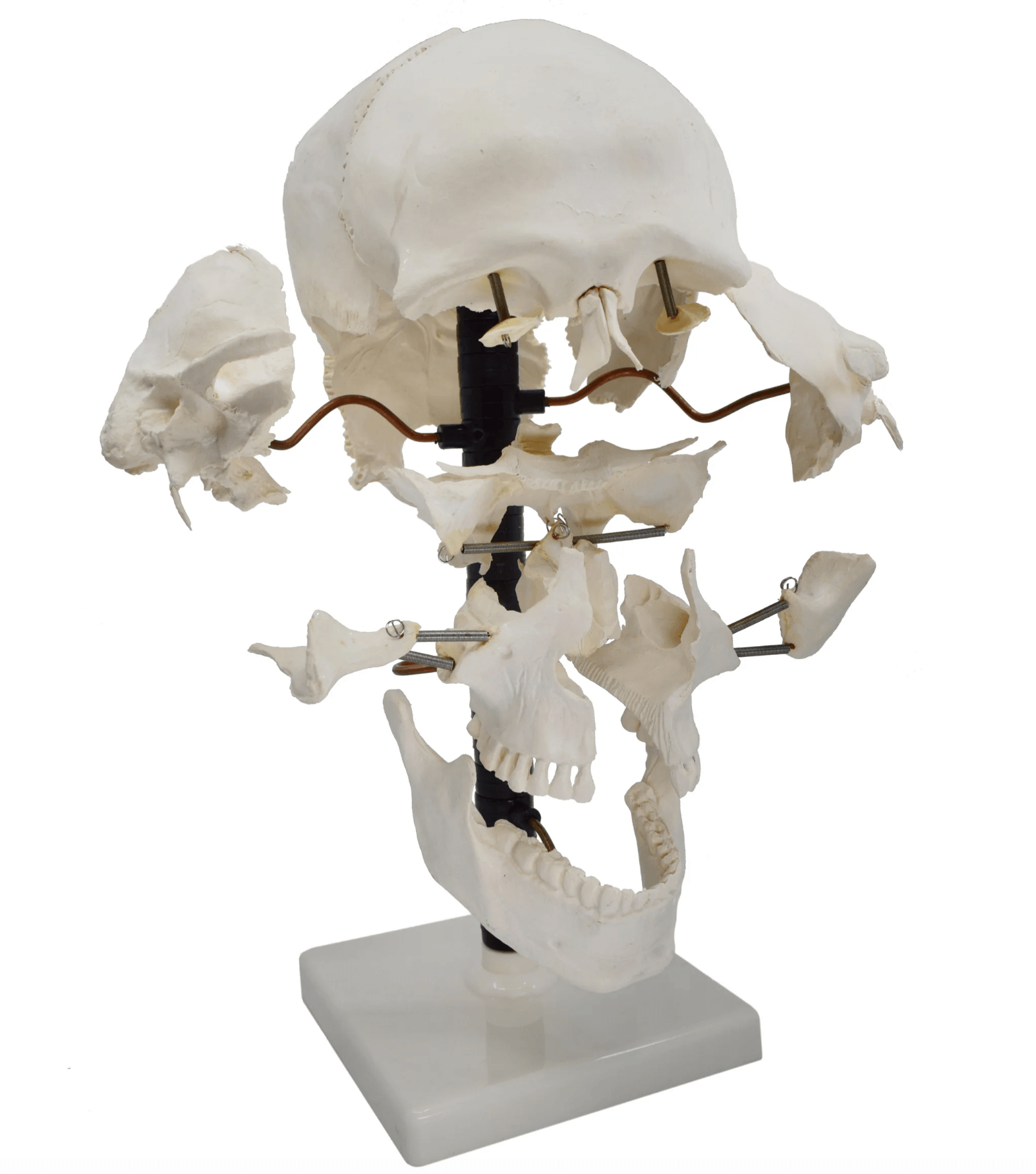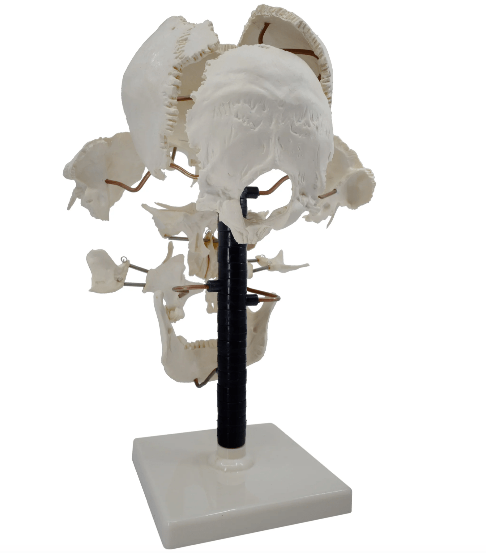 - Articulated stand allows for rotation of individually-mounted bones, while sphenoid, frontal, parietal, occipital, and temporal bones can be removed for closer study