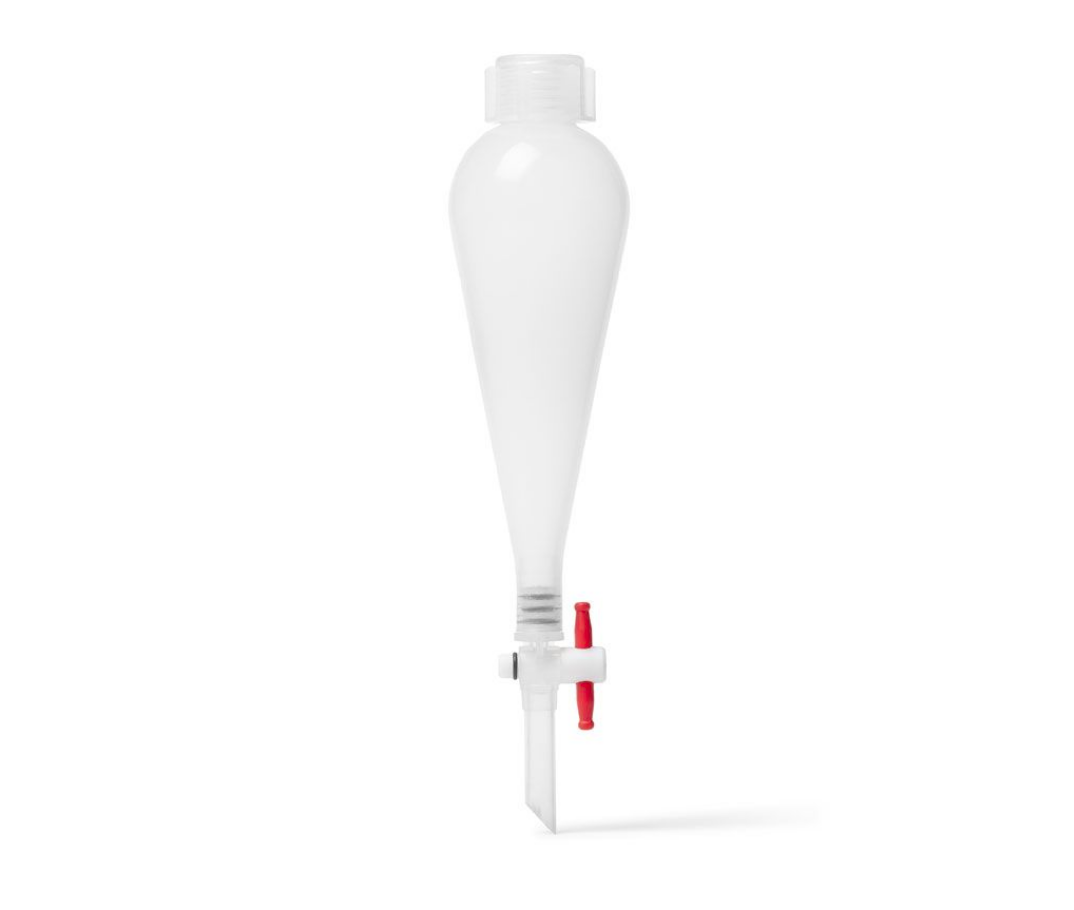 These pear-shaped polypropylene separating funnels feature excellent clarity and strength, and include a leak-proof threaded screw cap. The polypropylene stopcock is fitted with a self-lubricating PTFE plug. Not graduated.